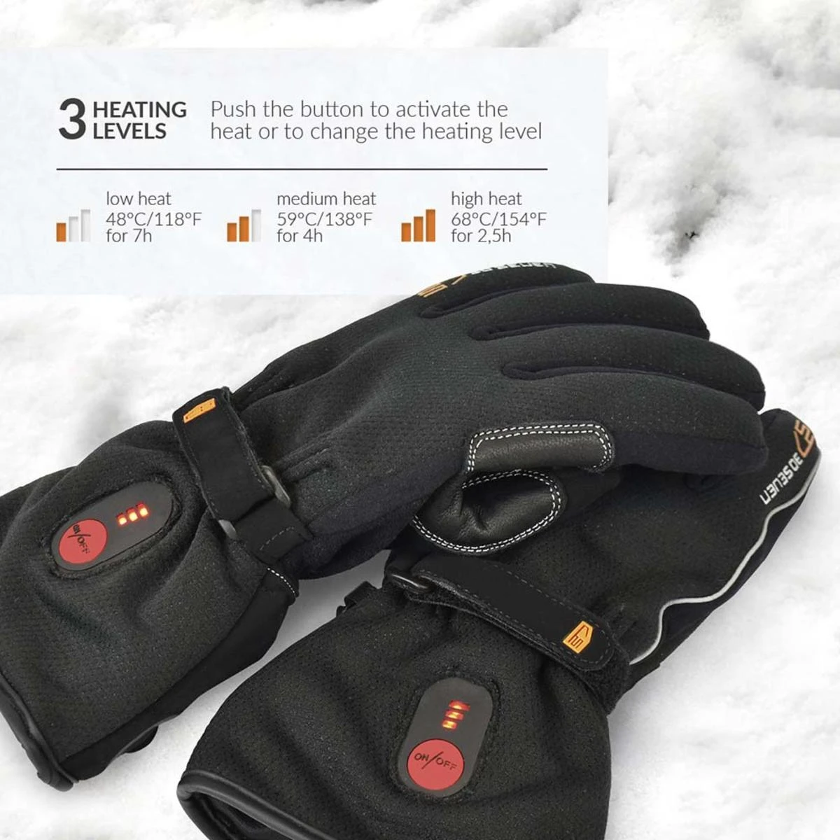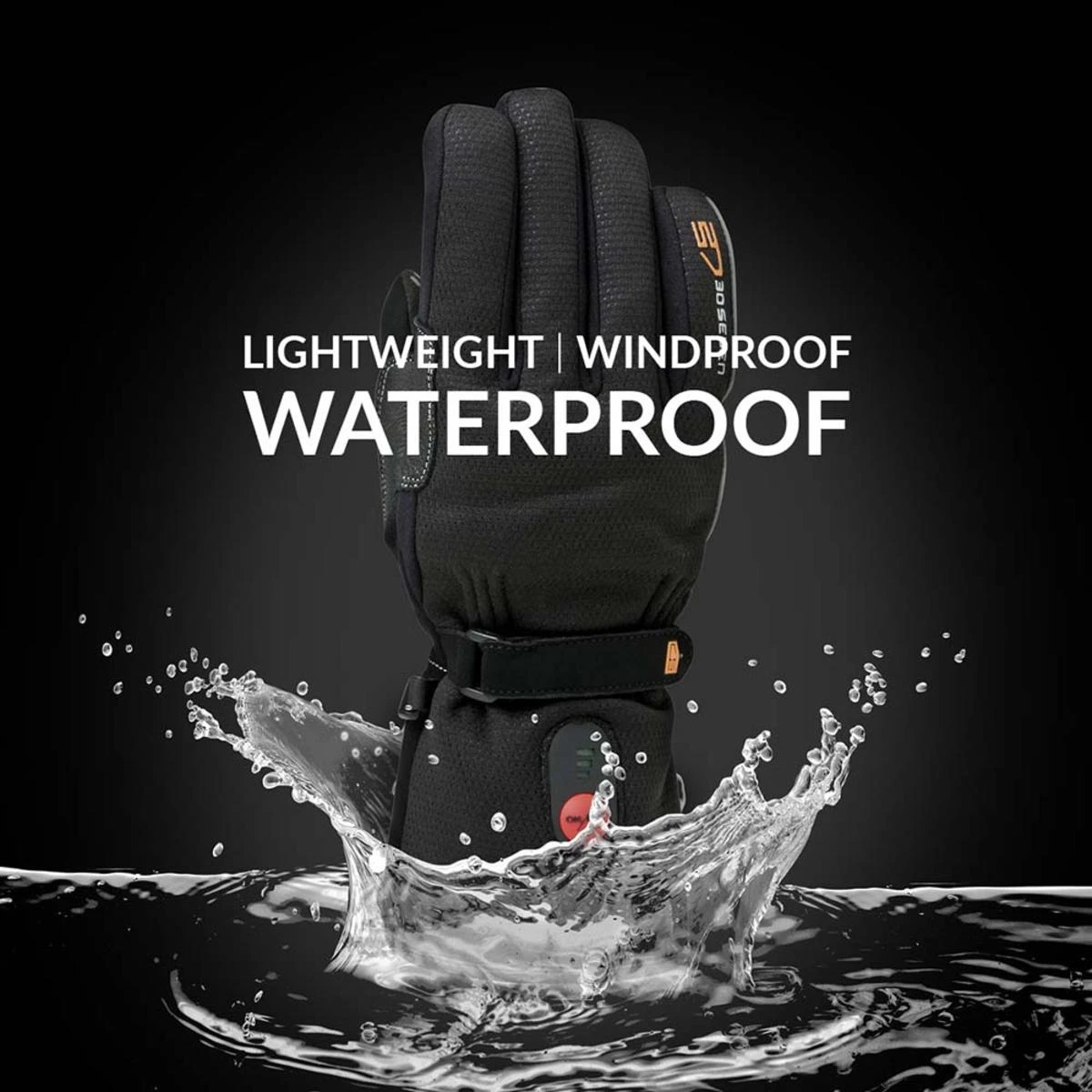 Never have cold hands again by wearing these heated waterproof gloves! Warm hands and fingers are guaranteed by the integrated Novaheat heating element, wind-blocking materials and Thinsulate insulation. The ergonomic fit, pre-curved fingers and adjustable Velcro strap make these gloves very pleasant to wear. Integrated Hipora fabric does not let water in, but allows air flow. The design of the glove is optimized by adding shockabsorbing padding and reinforcement between thumb and index. Use the button on the glove to set your preferred temperature for the back of your hand, your fingers and your fingertips.