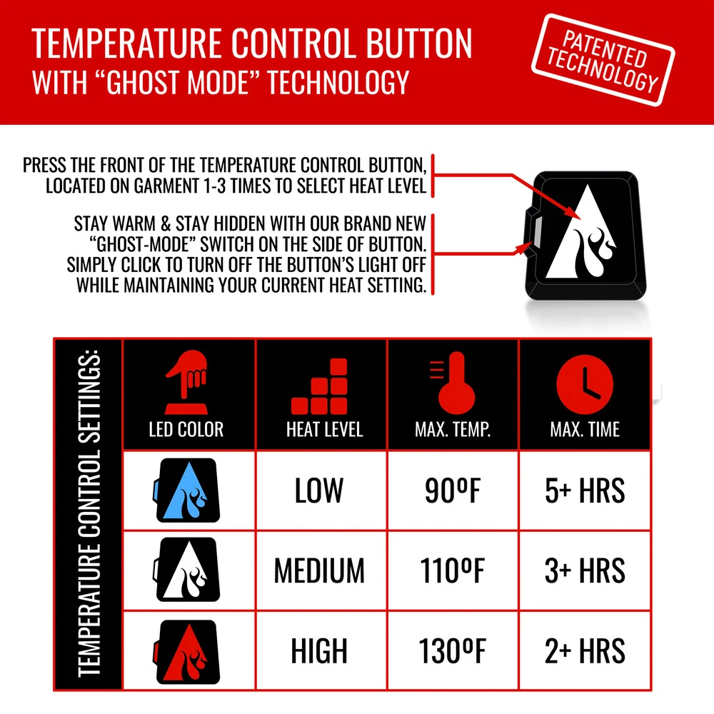 - Turn On – Press and hold touch-button control on the balaclava for 3 seconds. Press touch-button to adjust the temperature.