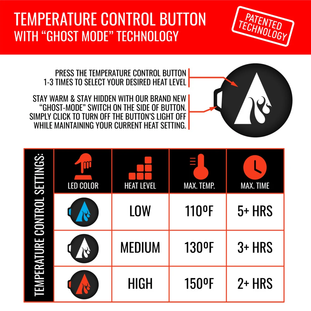 - Turn On – Press and hold the touch-button control on the hat for 3 seconds. Press the touch-button to adjust the temperature.