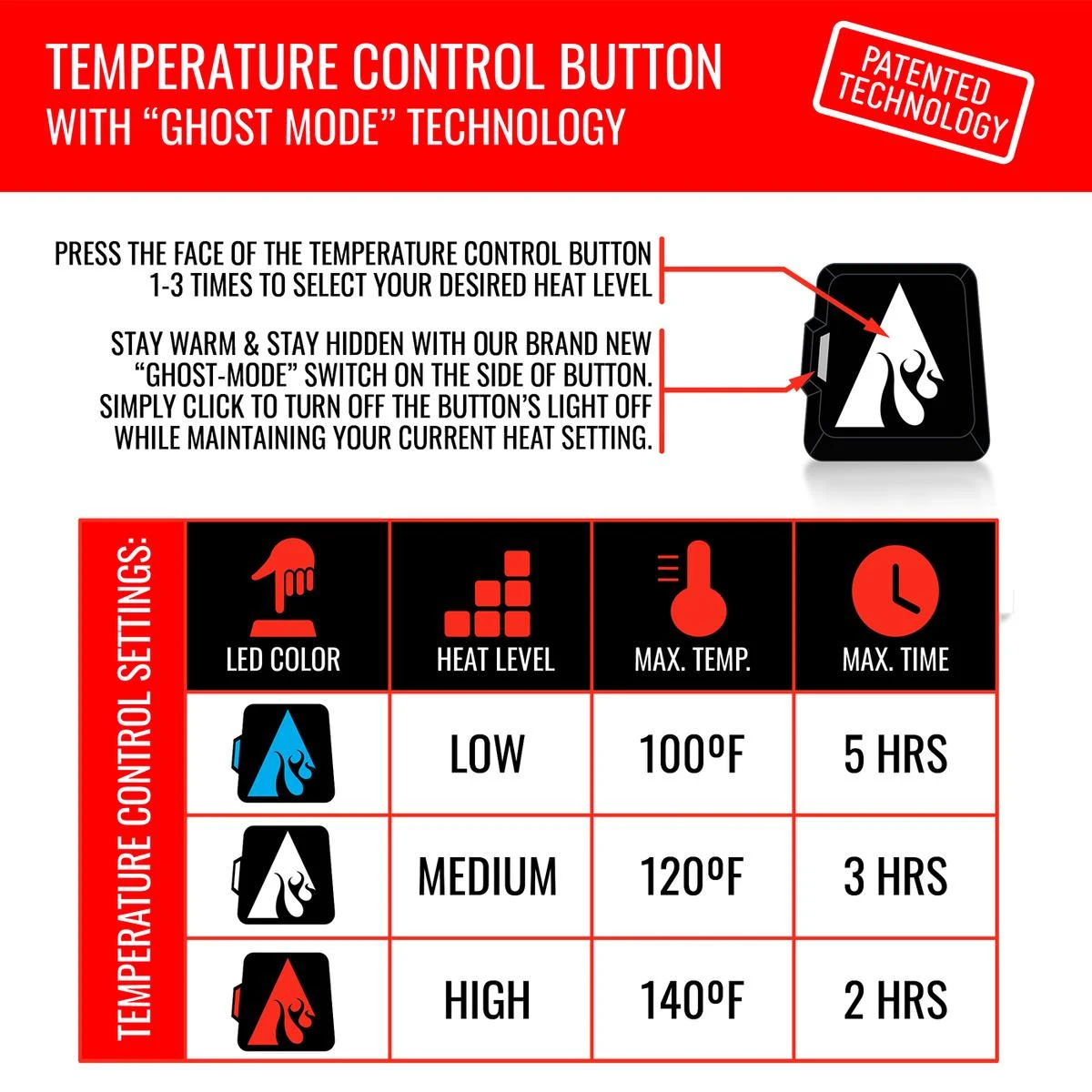 The ActionHeat gloves feature touch-button technology, with 3 easy to use heat settings. The gloves will reach a maximum temperature of 140F and can last up to 5+ hours.