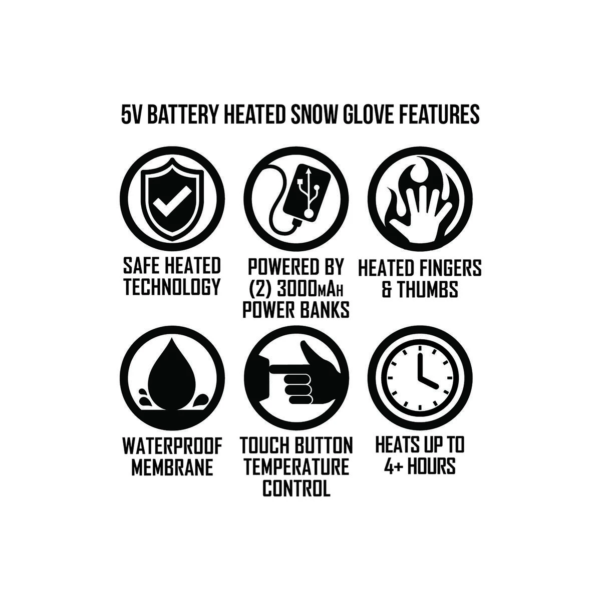 The ActionHeat snow gloves feature touch-button technology, with 3 easy to use heat settings. The gloves will reach a maximum temperature of 145F and can last up to 5+ hours.