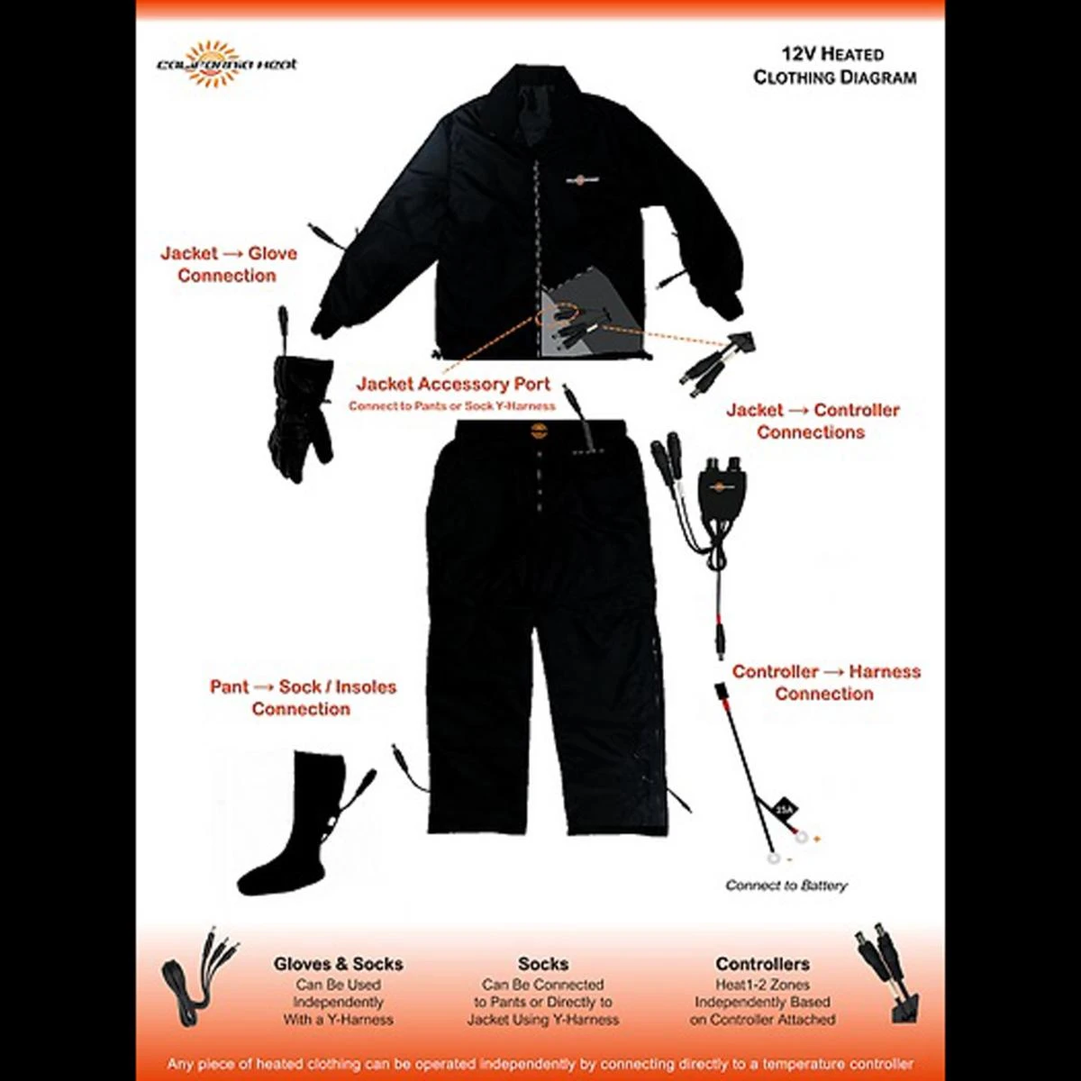 Note: Each person must have their own temperature and power adapter (Battery Harness, Accessory Plug, etc). Using only one controller and/or power cable for more than one individual’s heated outfit may overload the 12V battery or controller and could result in damage to the products, cause them to malfunction, and/or cause bodily harm.