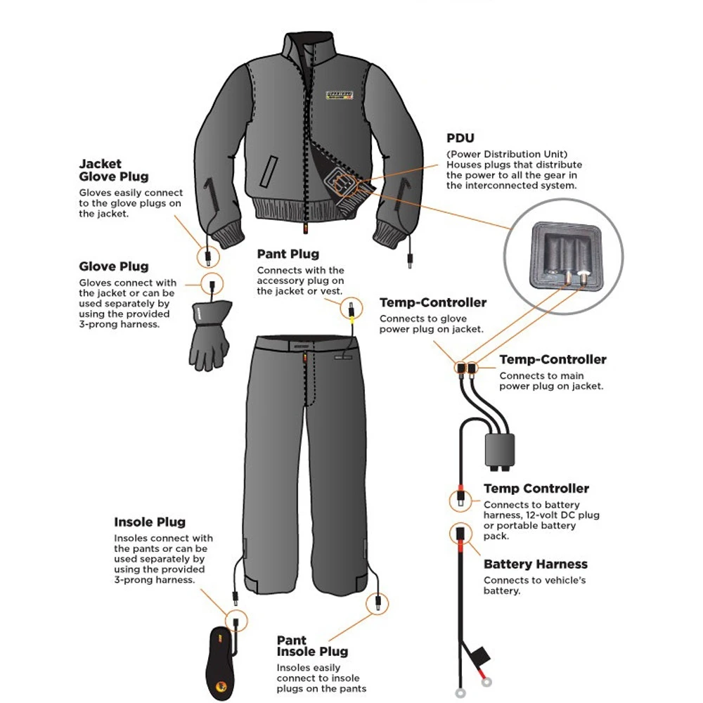 System is powered by a simple connection to your vehicle’s DC power system. Connects to your motorcycle, snowmobile, ATV, boat or even airplane to keep you warm at the temperature of speed.
