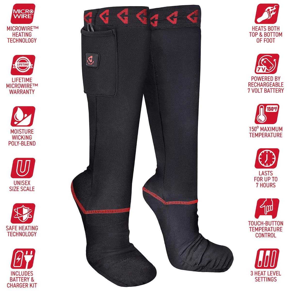 The Gerbing 7V heated sock liners are the best battery-powered socks available. Equipped with powerful Gerbing 2200 mAh batteries and powered by Gerbing’s patented microwire heating elements, these socks will provide up to 7 hours of temperatures up to 150° F. The heating elements cover both the top and the bottom of your foot for maximum warmth during all of your winter activities.