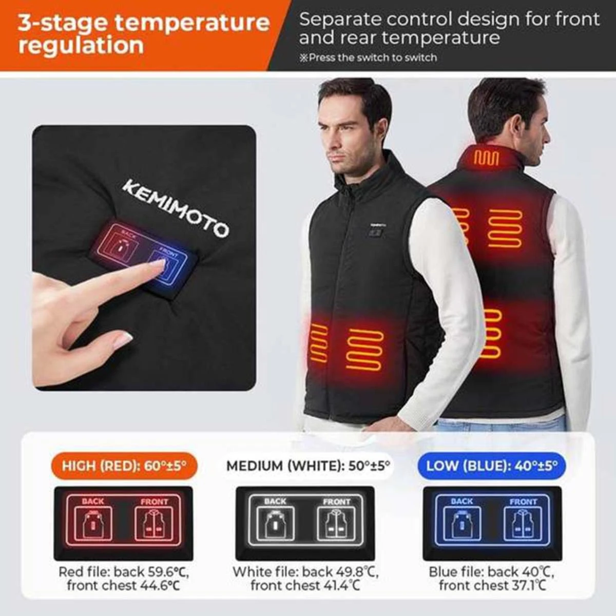 KemiMoto Dual Power Heated Vest is the only one in the industry that uses carbon fiber heating sheets to heat textile UTV/motorcycle heating vests. It has 6 heating area (1 on the neckline, 3 on the back, and 2 on the abdomen), and the pocket also has a heating effect. This heated vest is made of highly flexible waterproof and windproof materials that will keep you warm and dry in wet or windy conditions. When the weather gets cold, just press a button to heat up! Dual Power can handle any weather, and if you are riding in extreme conditions, the Dual Power system is ready. The dual-power heating vest is a must-have for winter equipment.