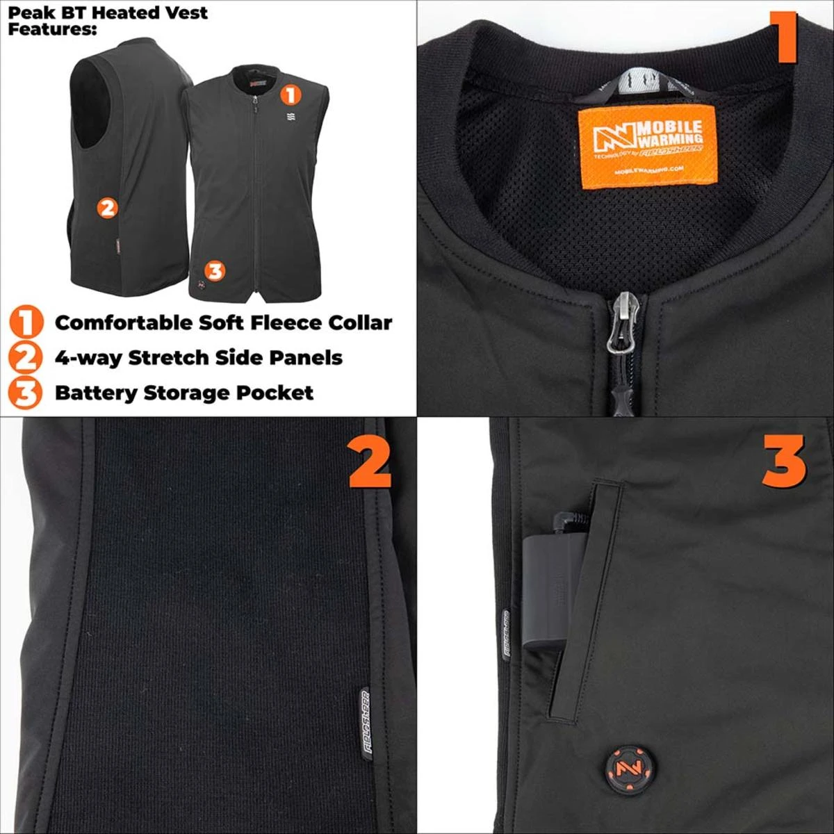 The Fieldsheer Peak BT heated vest is a low-cost unisex heated vest that is favored by many for its light design that allows it to function as either an outer shell or a baselayer. Engineered to keep outside elements out, the Peak heated vest is constructed with Windshark, a Fieldsheer fabric technology designed to take on moderate weather, and a comfortable 4-way stretch material. Look to this highly breathable lightweight heated jacket to provide a water- and wind-resistant shell. The mid-weight Peak BT heated vest is thick enough to be worn as your outer layer and thin enough to be used under a larger ski heated jacket or heavy work coat. The Peak BT heated vest has integrated, concealed heating panels powered by a sturdy yet lightweight 7.4-volt Mobile Warming heating system. The 7.4-volt system has 3 heating elements, one on the back and 2 on the chest, that add heat to critical areas that keep your core warm. The Peak BT 7.4-volt heating system can provide temperatures ranging from 135°F on high to 90°F on low. On high, expect up to 2 hours of heat on high, and on low, the Peak BT can provide heat for up to 10 hours! The Peak BT has 2 ways to adjust the temperature. First, the built-in touch control button. With a simple button push, you can select from 4 heat settings. Second, we’ve incorporated Bluetooth control with our MW Connect app. Through the MW Connect app, you can quickly toggle through all connected Mobile Warming devices and adjust individual heat levels to your liking. MW Connect allows you to get real-time updates on battery levels and update your garments when new firmware becomes available. Throw it on under your camo, snow-heated jacket, uniform, or just wear it to the next ball game. The Peak BT heated vest is ready for any event.