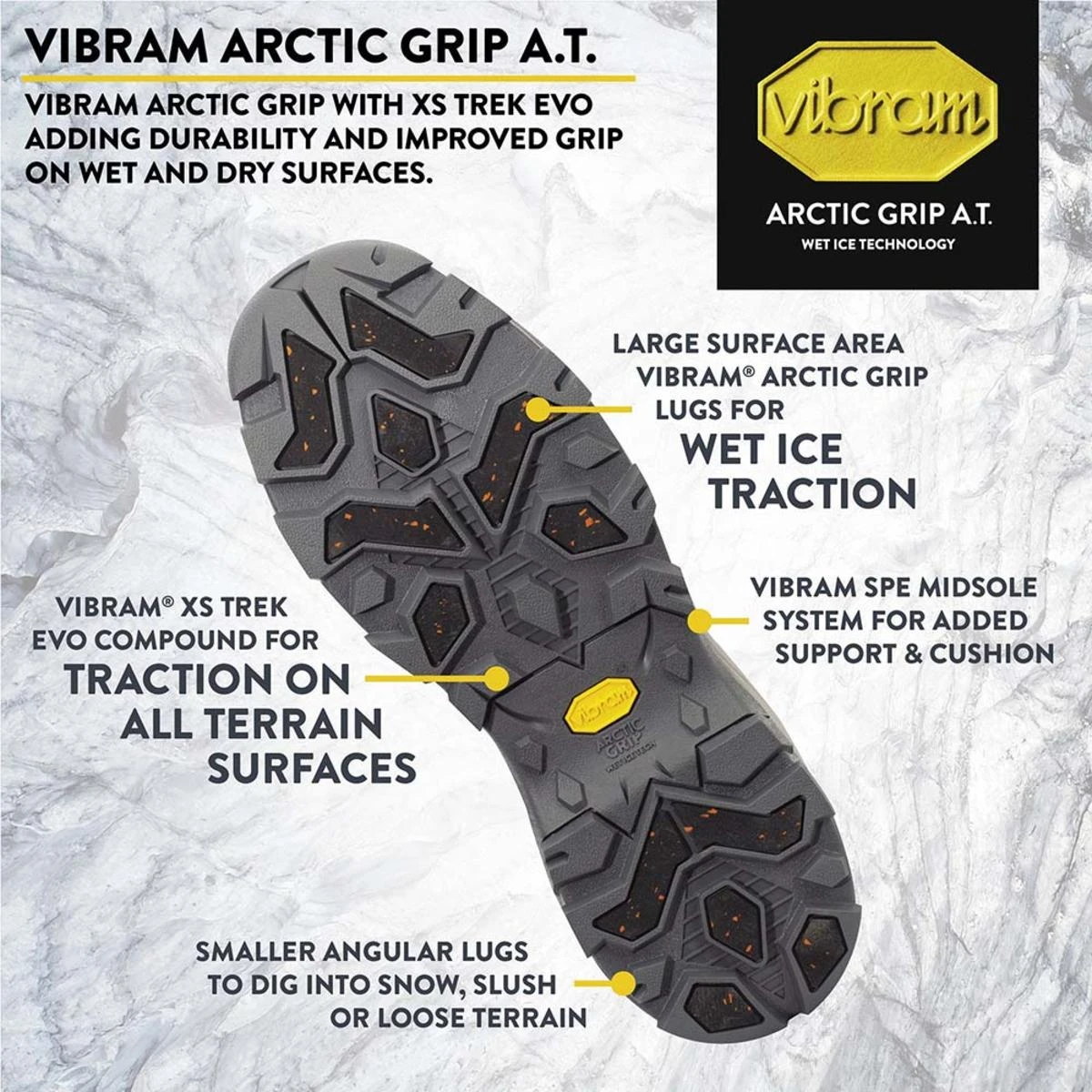 - Vibram Artic Grip A.T. For wet ice traction coupled with XS Trek Evo adding durability and improved grip on wet and dry surfaces