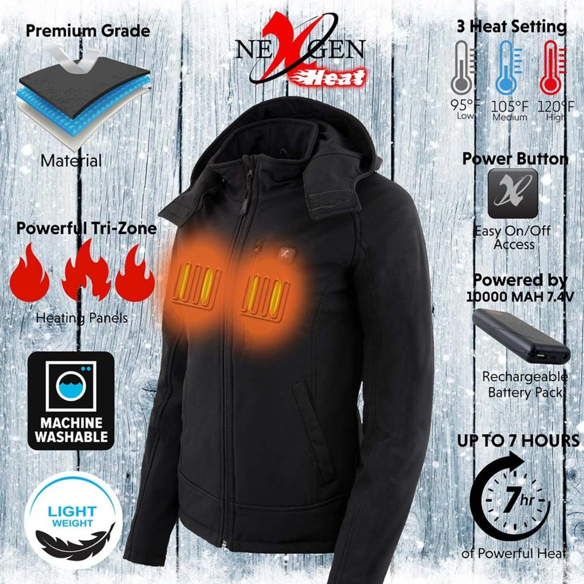 NexGen NXL2767SET Ladies ‘Ruffled’ Black Heated Soft Shell Hooded Jacket- Rechargeable Battery Pack Included)