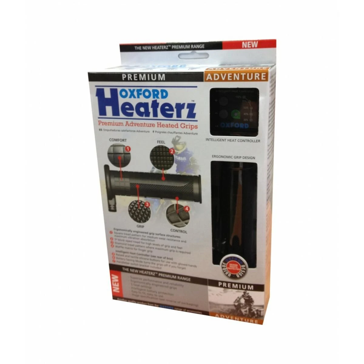 The Oxford Heaterz Premium Adventure heated handlebar grips are made especially for adventure bikes. The grips have ergonomically engineered surface structures to optimize riding performance. Thicker rubber in areas of maximum wear; rhombus tread patterns for high levels of grip and feel; diamond tread pattern where maximum grip is required. What really sets the Oxford Heaterz apart? The answer is many tried and tested features such as the silicon cables which provide flexibility in the coldest weathers and the winter grade wiring prevents cracking and short circuits; the bonded grip design has been in use for many years and is well proven; the grip compound and thermo plastic rubber construction is designed to absorb vibration making them extremely comfortable and durable, often outlasting standard grips and the silicone wires that come from the grip are angled to eliminate water ingress and resulting corrosion/ice damage and have special unique internal supports which are heat shrunk together to prevent damage if the wires are snagged. In addition, five carefully chosen heat settings allow the perfect temperature to be selected in All weathers and most importantly, the switch will switch off if the voltage drops to 10.5V to ensure that the battery is not damaged to the point that it cannot be recharged to full capacity. This latest Premium range is the result of over 30 years of research and development by engineers and motorcyclists, which are now easier than ever to fit due to the new intelligent heat controller eliminating any need to wire the positive to a live ignition feed; simply connect the 2 ring connectors to the battery. You’ll find everything supplied by Oxford to fit your Heaterz from a wiring loom with ring connectors to the battery with simple plug and play waterproof connectors to attach to the switch and grips, smart mounting bracket and switch right down to the glue and cable ties all neatly packaged in one box.