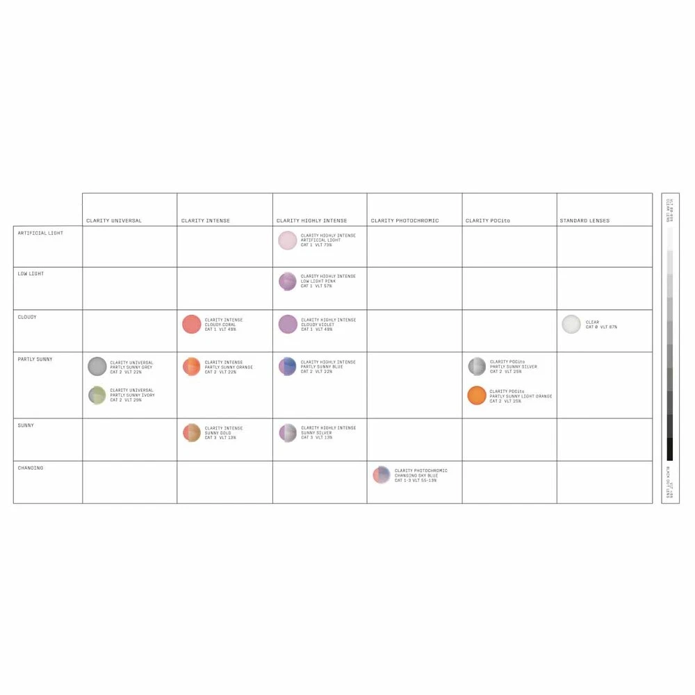 - Ri Pel anti dirt and water treatment: The Ri Pel hydrophobic and oleophobic treatment protects from dirt, water, sweat, salt, oil and dust, and also makes the lenses easier to clean. It features on all lenses apart from the Clarity Intense Partly Sunny Orange, which features a hydrophobic coating only
