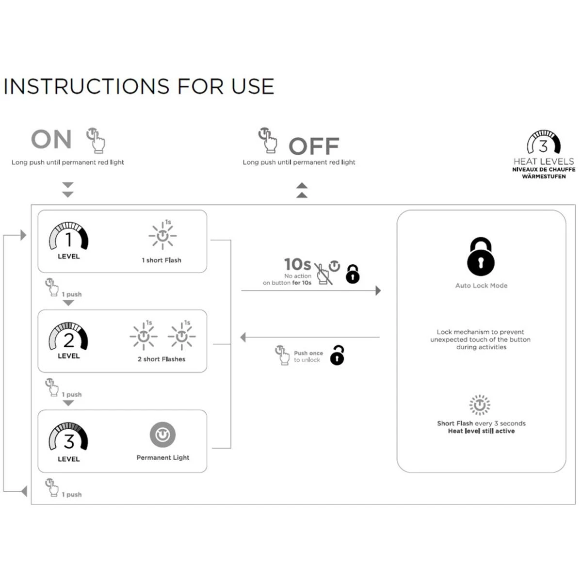 - S-Pack without bluetooth The S-Pack battery has 4 operating modes: POWER OFF – IN USE LEVELS . They are indicated with the heating level display on the S-Pack battery. The LED flashing modes corresponds to the selected heat setting.