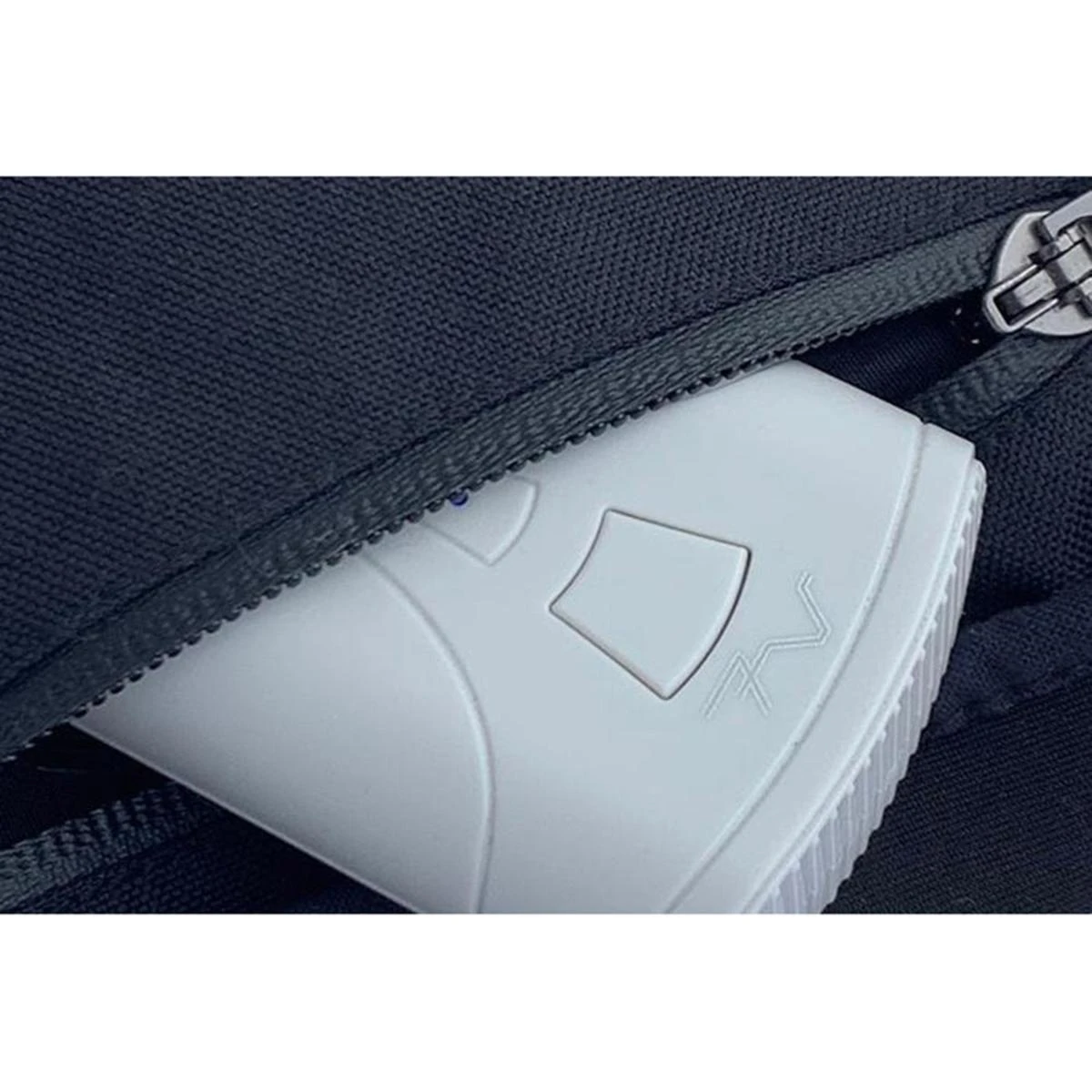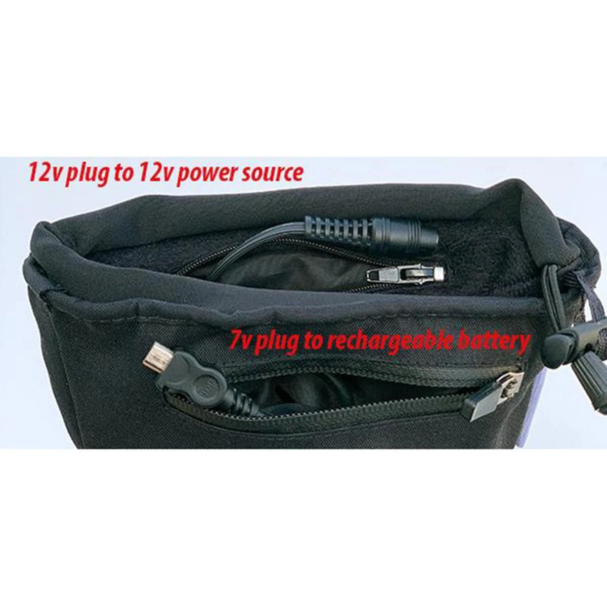 The 7v battery and mating 7v plug is stored in a waterproof zippered pocket on the underside of the gauntlet cuff. The 12v coax plug is stored in a zippered pocket located on the upper inside lining of the gauntlet cuff.
