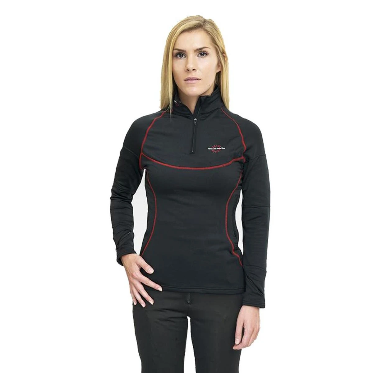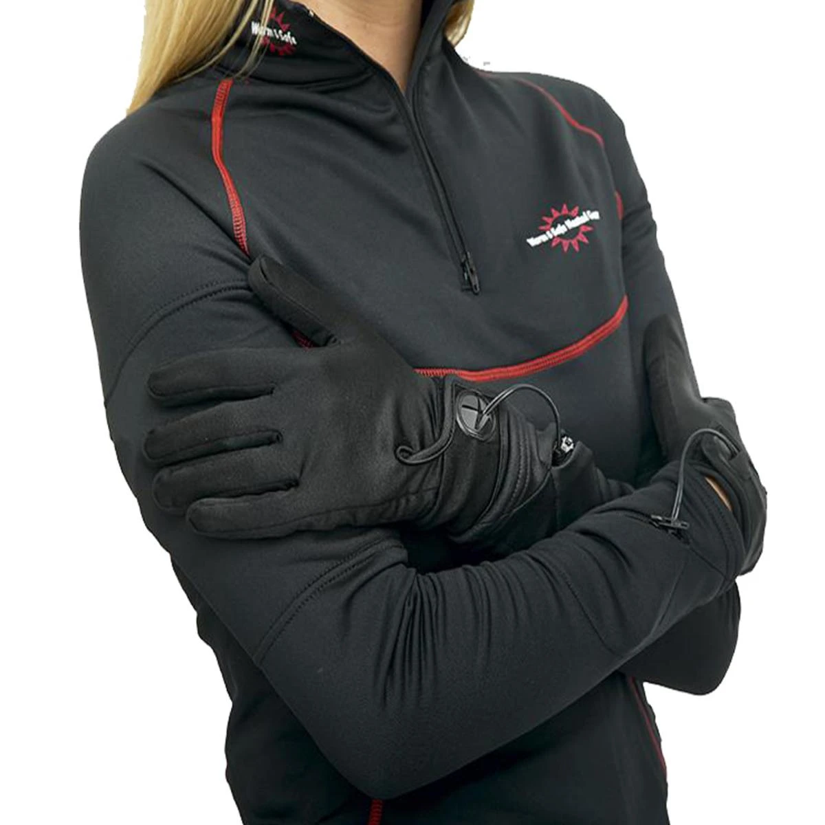 Women’s Heated-Neck Long Sleeve Heat Layer This version of the Heat Layer has 9 areas of heat. Two panels in the chest, wo along the side of the chest, two in the upper arms, a heated collar, one panel on the back and one on the lower back. It also has connections at the end of the sleeves for gloves or glove liners.